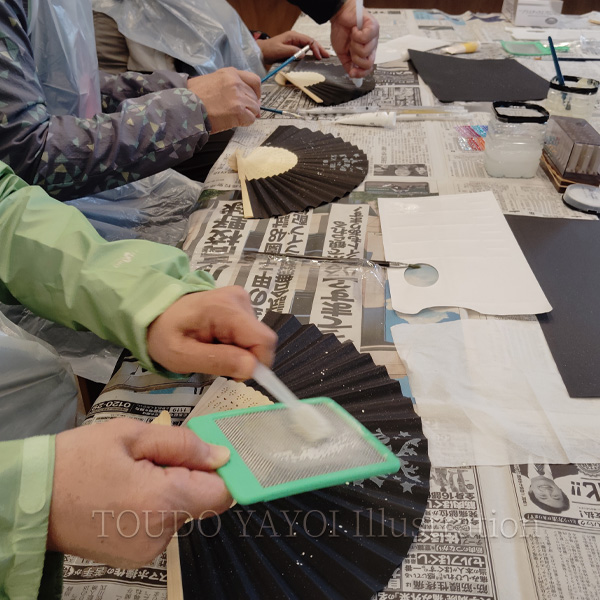 わたくしの特性である「水彩画」と「星空」を融合させ「スパッタリングで描く自分だけの宇宙」と題し、扇子作りを。