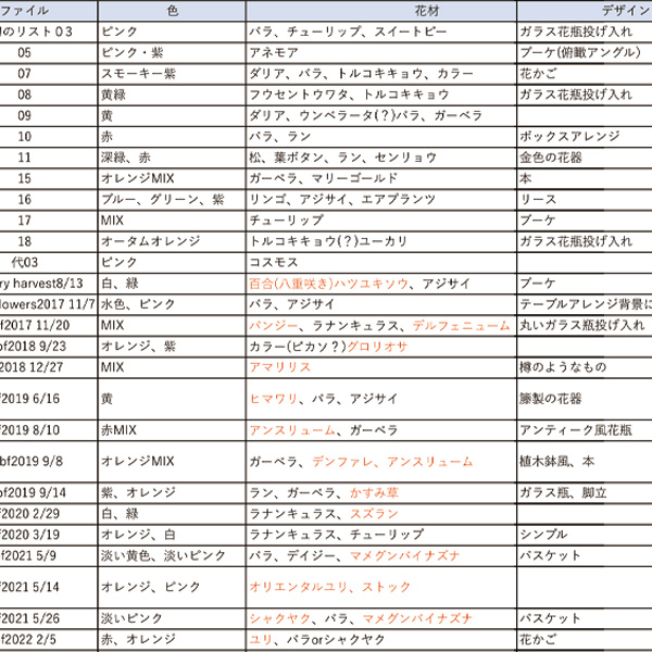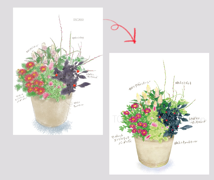 文字数の多い花材名をイラストに直接書き込むことによってより一層視覚での理解力が上がります。